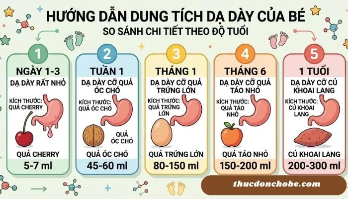 Dung tích siêu nhỏ: Ở mức 6 tháng tuổi, dạ dày con chỉ bằng một ly nước nhỏ (khoảng 100ml). Việc ép con ăn nguyên 1 bát cháo đầy là phản khoa học.